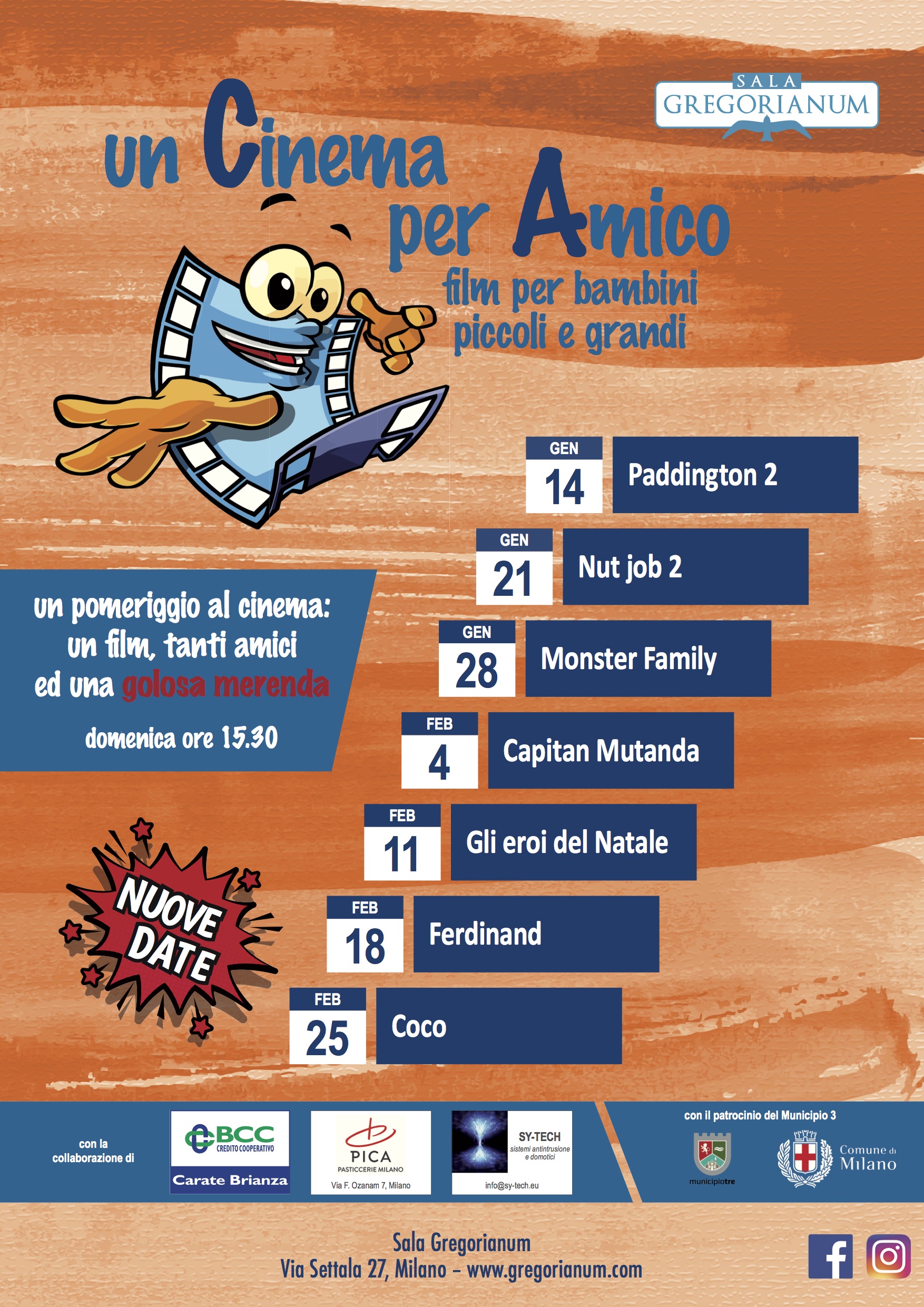 Al via la seconda parte della stagione cinematografica dedicata ai bambini della Sala Gregorianum. Un appuntamento settimanale, la domenica pomeriggio alle ore 15:30, apprezzato a livello cittadino e particolarmente dedicato al giovane pubblico del Municipio 3 che avranno la possibilità di trascorrere accompagnati dai genitori, un pomeriggio di coinvolgente divertimento in sala, da concludere con la merenda offerta dalla pasticceria Pica. Per gli instancabili anche la possibilità di proseguire con qualche gioco disponibile nell’area bar. Un’occasione di trascorrere i pomeriggi freddi immersi in un clima accogliente, aggregante per piccoli e adulti, con ingresso a soli 5 euro.