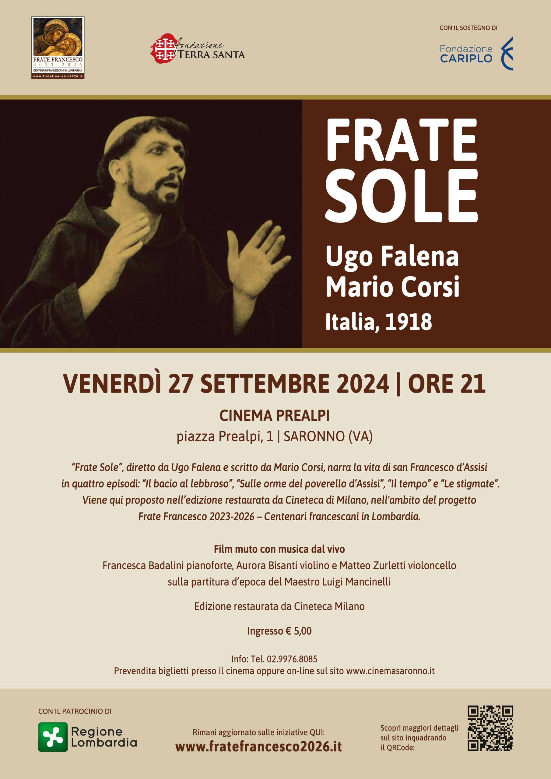 Il progetto "Frate Francesco 2023-2026. Centenari francescani in Lombardia" porta in sala Frate Sole, il film di cent'anni fa che racconta la storia di San Francesco d'Assisi, musicato dal vivo da un terzetto di pianoforte e archi. Il Cinema Prealpi di Saronno ospita la proiezione della versione restaurata dalla Cineteca di Milano nella serata evento di venerdì.