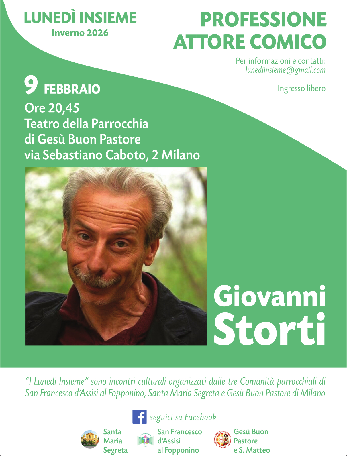 Lunedì 9 febbraio, alle ore 20.45, il Teatro della Parrocchia di Gesù Buon Pastore accoglie il comico Giovanni Storti per i «Lunedì Insieme», incontri culturali organizzati dalle tre Comunità Pastorali di San Francesco d'Assisi al Fopponino, Santa Maria Segreta e Gesù Buon Pastore di Milano.